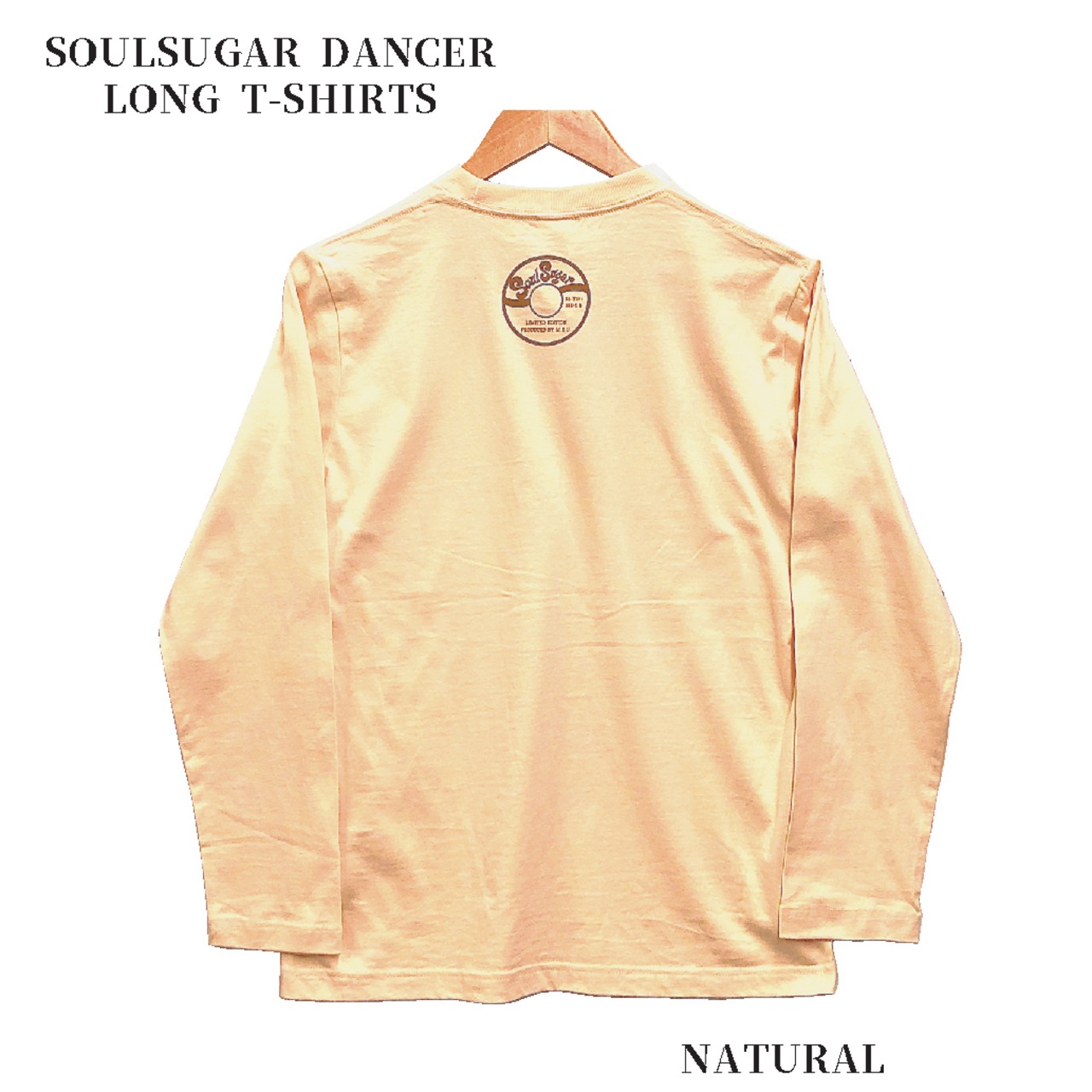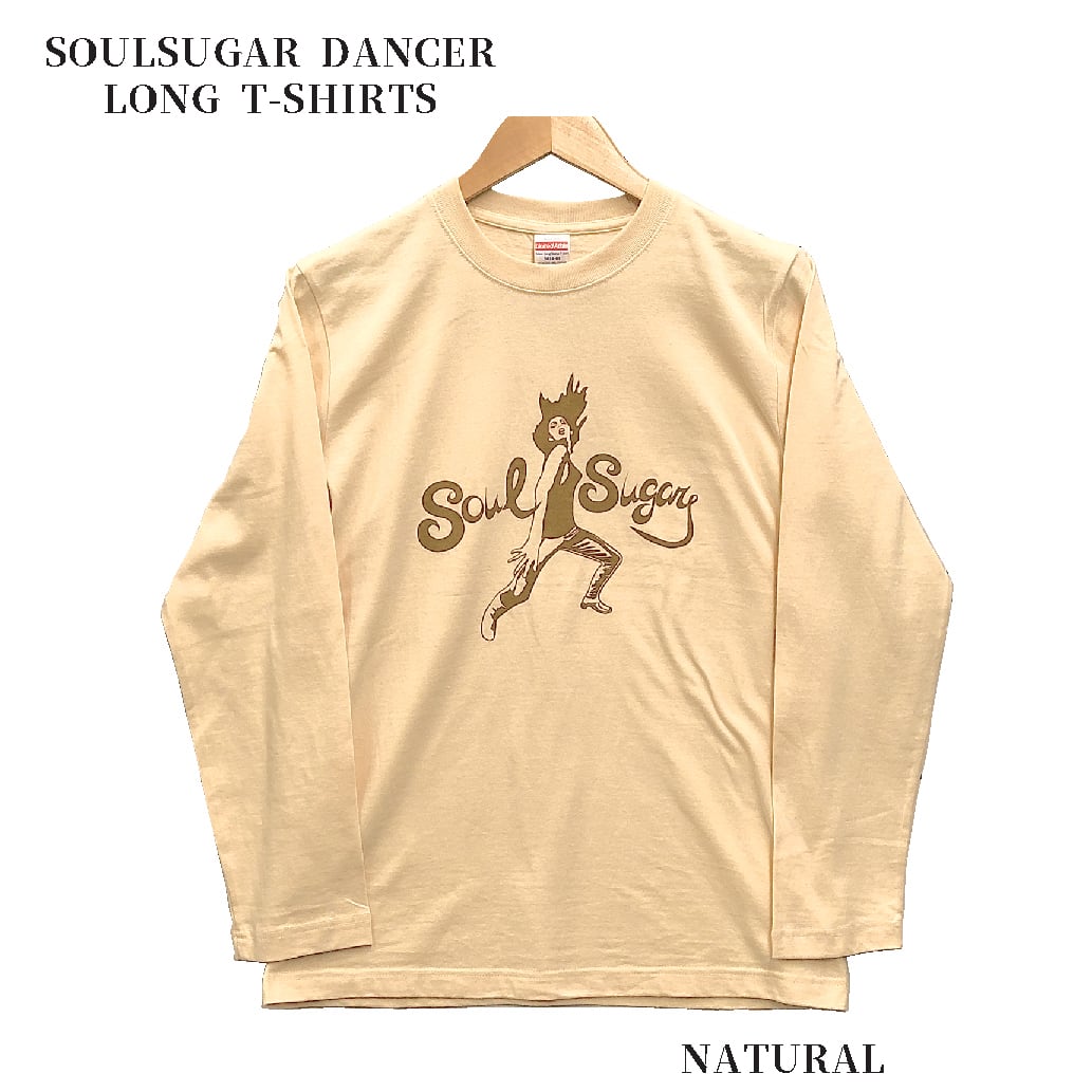 SOULSUGAR新作ロゴ:DANCING GIRLをプリントしたロング袖Tシャツです。プリントカラーはゴールドをイメージしたサンドイエロー。ボディはコットン100%、5.6オンス。しっかりとした厚みがある生地で、Tシャツとしての耐久性も申し分なしです。サイズは