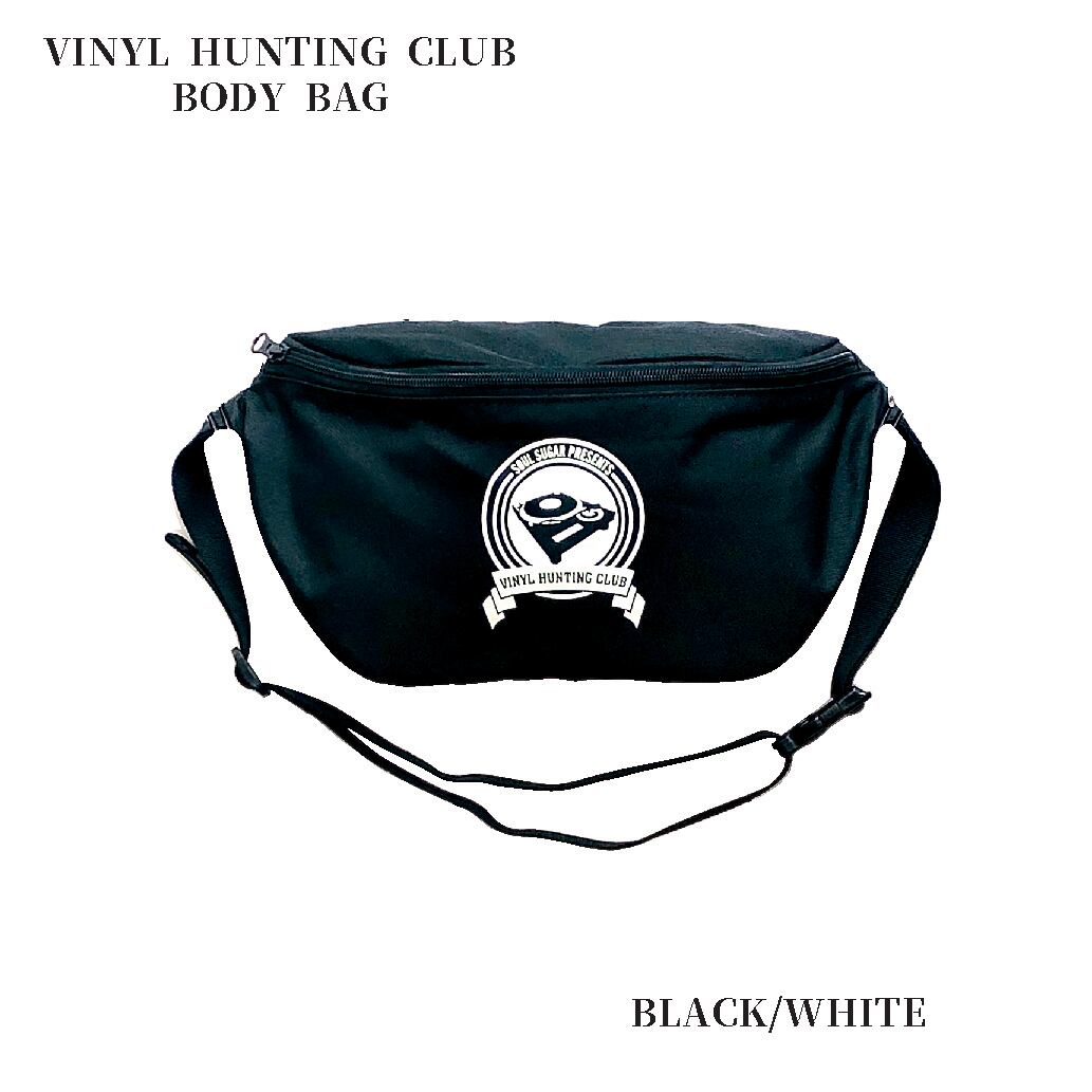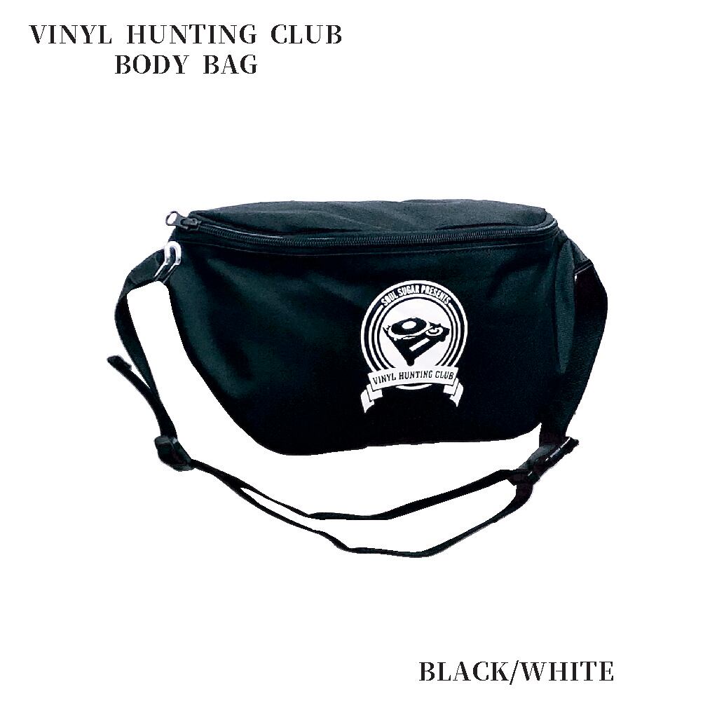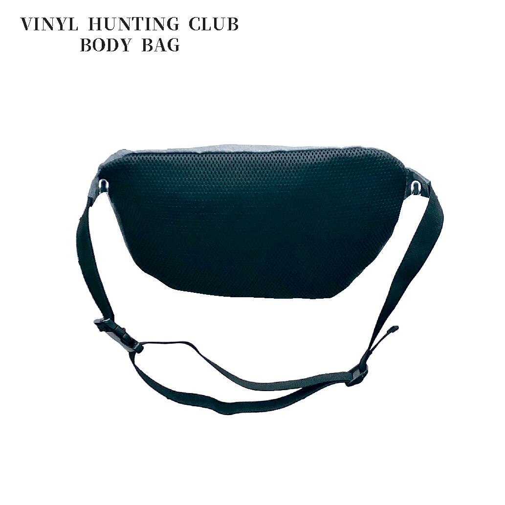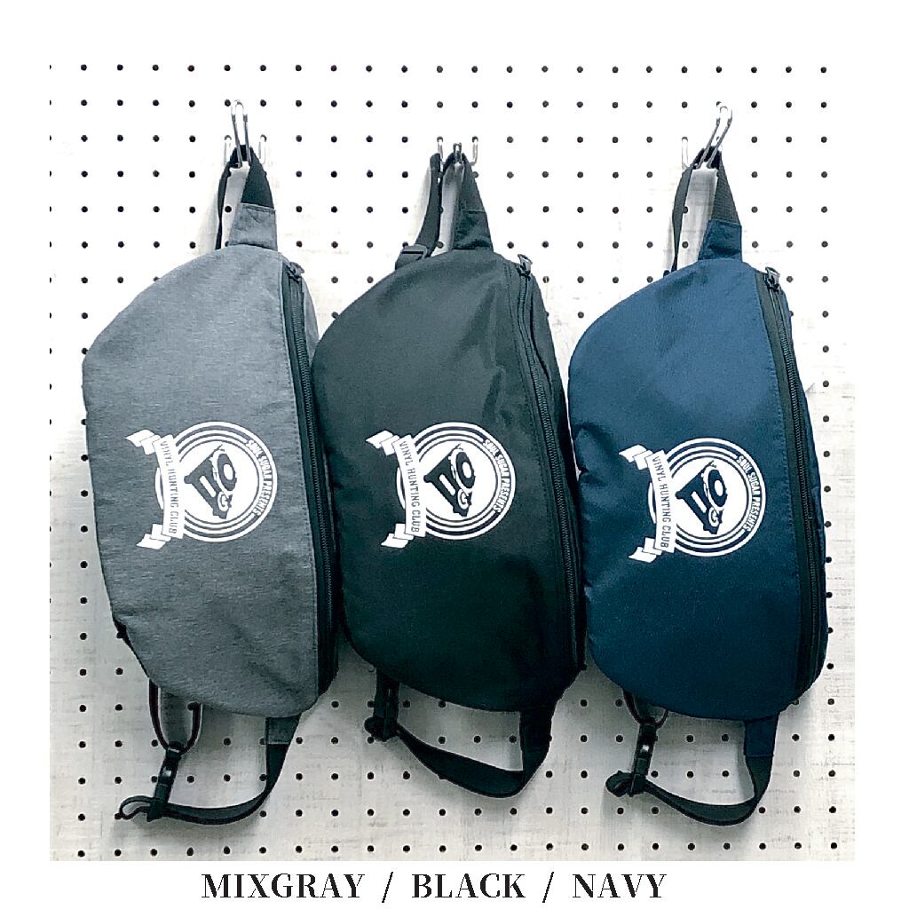 MeuオリジナルのNEW LINE/VINYL HUNTING CLUBのボディバック。撥水処理済の600Dポリエステル生地にシルクスクリーンでVHCロゴをプリント。サイズは高さ19、奥行最大9、底幅31㎝で約9リットルの収納容量があります。ショルダーテープの長さ調整範囲は93㎝まで。2つの内ポケット付き。スマホ、お財布、ハンカチ等の携帯必需品を持ち運ぶにはジャストな大きさと軽さです。こちらのカラーはブラックになります。